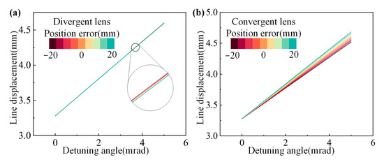 Since only the lens changes the beam’s divergence angle during its propagation, and the positional errors of the other optical elements only change the propagation distance of the beam, the relative positional errors between each optical element can be converted to the positional error of the lens for calculation. When the lens position is varied in a certain error range, the variation of the detuning angle/peak energy displacement curve is shown in Figure 21, which shows that the position shift of the lens changes the slope of the stripe displacement curve. The trend of the stripe displacement curve with the position error of the lens is shown in Figure 22. The trend of the influence of the diverging lens on the slope of the stripe displacement curve is on the order of 10−3. The positional error of the diverging lens allowed by the index parameter within the measurement range of the crystal detuning angle is 18.87 mm, so the tiny displacement of the diverging lens caused by vibration and other factors is entirely within the measurement error. The influence of the converging lens on the slope of the stripe displacement curve tends to be larger, and the positional error of the converging lens allowed by the index parameter is 1.025 mm, so the positional error of the converging lens is an essential index for the error monitoring of the measurement system.