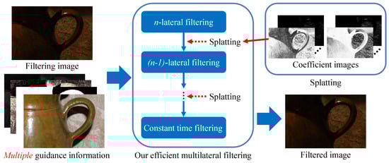 Algorithm overview. n-lateral filtering denotes multilateral filtering that multiplies a spatial filter and range filters. Examples of multiple guidance information are flash images, segmentation masks, and depth maps. The key point of the proposed algorithm is that it decomposes multilateral filtering into a set of constant-time filters. For more information on implementation, our code is available at https://fukushimalab.github.io/dmf/ (accessed on 16 January 2024).