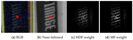 We can expect a higher edge-preserving effect using multiple guidance images (e.g., a set of multi-sensor signals), and recently, we have been able to capture not only RGB images but also infrared, hyperspectral, depth, and other images by new devices (e.g., infrared/hyperspectral cameras and depth sensors). The images have different edge information and signal characteristics from RGB images. The multiple guidance information is helpful for improving signal visibility and the signal-to-noise ratio [,]. In other cases, we can deal with a self-generated image and inversely rendered maps as an additional guidance signal [,].