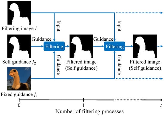 MF is also helpful in self-generating multiple guidance information from single guidance information, such as rolling guidance filtering []. Rolling guidance filtering is iteratively processed using the filtered image as the guidance image. In this regard, the filtering image is fixed as the input image and the guidance image varies. This iterative representation can be applied to multilateral filtering with some modifications. We call it multilateral rolling guidance filtering (MRGF) and show the actual processing in Figure 4. The main difference is the filter output as an additional guidance image.