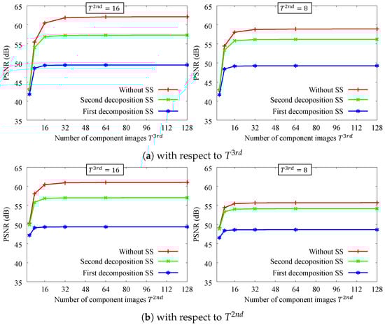 PSNR accuracy with respect to the number of coefficient images. The parameters are , , . SS denotes spatial subsampling rates, . We tested 4 images for the input image.