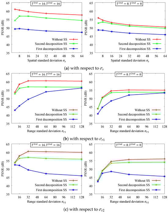 Figure 6 shows the filtering accuracy of the smoothing parameters. Although the accuracy of DMF varies depending on the parameters, ours has a high accuracy. We can see that it is not very sensitive to changes in spatial parameters . Each of the two guides has similar range parameters and . The smaller the range parameter, the lower the approximation accuracy tends to be, and the effect is more pronounced when the number of decompositions is small. Initial subsampling is also susceptible to this effect. However, the proposed method has an approximation accuracy that is generally better than 45 dB for all parameters, which is sufficient because it becomes difficult for a person to distinguish between two images at around 40 dB [].