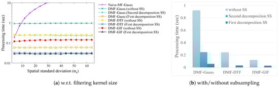 Figure 7 shows the processing time results. The processing time of the naïve ML-Guass increases exponentially as the filtering kernel size increases, whereas DMF can be computed in constant-time from Figure 7a. DMF is especially efficient when we use GIF or DTF for the filtering step described in Section 6.1. Furthermore, DMF becomes more efficient by subsampling the spatial domain as shown in Figure 7b. Since DMF and GIF are not decomposable by the proposed method, only a one-step decomposition is possible. Therefore, the computation time for the second decomposition subsampling has not been reported.