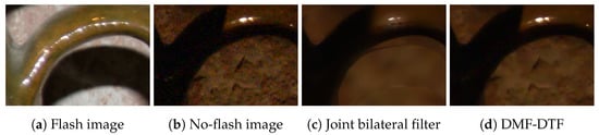 We compare the computational time in two cases for efficiency evaluation. One is a comparison between naïve MF and DMF combined with some edge-preserving filters. Another is a comparison with/without subsampling. In this experiment, we apply real-time bilateral filtering (RTBF) [,], guided image filtering (GIF) [] and domain transform filtering (DTF) [] to (20). Note that we call DMF with these filters DMF-Gauss, DMF-GF, and DMF-DTF, respectively. Since RTBF can be interpreted as DMF with one guide image for Gaussian filtering, this is equivalent to DMF with two guide images for Gaussian filtering. Therefore, we refer to it as DMF-Gauss. For this experiment, flash and no-flash images were converted to grayscale, and the RGB no-flash image was filtered. In DMF-Gauss, the two-channel images were used as guides; in DMF-DFT and DMF-GIF, the no-flash images were used as guides for DMF, and the flash images were used as guides for DTF and GIF. Note that joint filtering is available for DTF and GIF. Cache-efficient filtering was computed using a one-pass version of Gaussian filtering for DMF-Gauss and box filtering for GIF [].