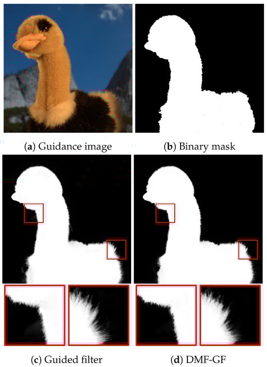 where denotes a decomposing operator, as described in Equations (11)–(13). Equation (14) summarizes the DMF formulation. Since (e.g., Gaussian filtering) can be computed in constant-time per pixel by recursive algorithms, and the decomposing operation is independent of kernel size, DMF can also be computed in constant-time.