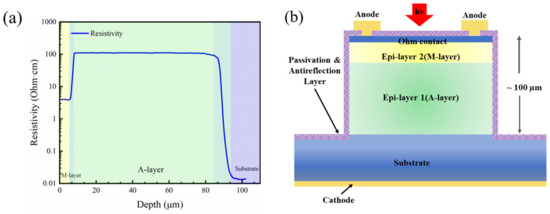 For the design epilayer of the silicon DMSI-APD presented in this work, the traditional separate absorption and multiplication (SAM) structure in the silicon APD is employed. However, unlike previously reported silicon APD fabrication processes, the main working layers in this paper were formed using multiple thick silicon CVD instead of ion implantation and a long-time thermal annealing drive in. Consequently, changes in the epilayer, including doping concentration and thickness, will influence the performance of the fabricated APDs, including dark current, breakdown voltage, and peak responsivity. In a previous study, we simulated the impact of the epi-absorption layer and the epi-multiplication layer on device performance [25]. The spreading resistance profile (SRP) measurement results of the epitaxial wafer are depicted in Figure 1a, while Figure 1b presents the cross-section schematic of the fabricated DMSI-APD. The device epilayer consists of an epi-absorption layer (A-layer) and a multiplication layer (M-layer), which are grown on a low-resistivity substrate using CVD technology. The A-layer and M-layer have a doping concentration and thickness of 1 × 1014 cm−3, 85 μm, 3.5 × 1015 cm−3, and 5 μm, respectively. All of these working layers were grown at 800~1000 °C. Furthermore, the thickness of the doping gradient layer from the substrate to the absorption layer and from the absorption layer to the multiplication layer is 10 µm and 2 µm, respectively, as shown in Figure 1a.