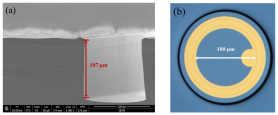 To elucidate the fabrication process of the device more clearly, the improved ultra-concise process flow is shown in Figure 2. The fabrication consisted of four main steps. First, the epi-wafer was cleaned using buffered oxide etch to remove the natural oxide layer from the surface of the grown wafer (step (i) in Figure 2), followed by standard silicon wafer cleaning processes (organic reagents as well as strong acid reagents). Second, the p–n junction was formed through low-energy phosphorus implantation at 30 keV with a dose of 2 × 1015 cm−2 (step (ii) in Figure 2). Afterwards, the implanted dopants were activated and the implantation damage was repaired through rapid thermal annealing (RTA) with annealing parameters of 1050 °C for 60 s. Third, the first photolithography was performed and the ultra-deep mesa was etched using inductively coupled plasma (ICP) etching, resulting in a mesa depth of approximately 107 μm, as shown in Figure 3a. In addition, the etching gas was C4F8 and S6F (flow ratio 1:1.2) and the etching temperature was 180 °C, the ICP etch rate was around 0.5 μm/cycle, and a total of 200 cycles were performed in the etch process. Next, the dry etched mesa sidewalls were passivated with silicon dioxide (SiO2), dry-oxidized for 2 h, and wet-oxidized for 15 min at 1050 °C and 600 °C, respectively (step (iii) in Figure 2). Fifth, the second photolithography was completed and an electric injection channel was etched out, followed by the deposition and patterning of Ti/Au alloy to form the metal pads. Finally, the third photolithography was finished and another Ti/Au alloy contact was deposited after chemical–mechanical polishing (CMP) on the backside (step (iv) in Figure 2). Figure 2 (v) and Figure 3b show the three-dimensional (3D)-rendered illustration and the final optical microscopy image of the fabricated DMSI-APD, respectively. Figure 3a also shows the etch profile of the device, with an etch depth of about 107 μm for the mesa, from which it can be seen that the sidewall is about 90° steep, with a good etch sidewall roughness. The top table surface in Figure 3b is the active region of the device, and the inside of the metal ring is the photosensitive surface of the device. The shadows around the active region in Figure 3b are due to the significant drop in device height. Compared with other existing silicon APD fabrication processes [7], the proposed whole fabrication process of the improved DMSI-APD requires only three steps of standard contact UV lithography, and furthermore, the active region is formed with just one low-energy (<30 keV) ion implantation step and rapid thermal annealing. The method exhibits much potential for reducing the fabrication time and steps, and lowering the manufacturing costs, especially ion implantation costs.