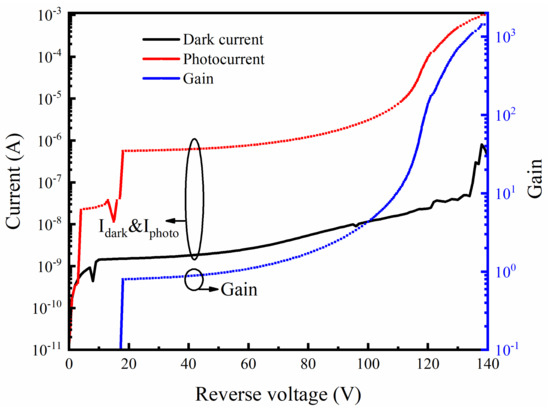 Figure 4 shows the dark current and photocurrent of a typical fabricated DMSI-APD at room temperature. The I–V characteristics were obtained using a Keithley 2635B, with a voltage step of 1 V and a noise current of 50 pA. For the dark current measurement of the fabricated device, the DMSI-APD was placed in a dark box and data acquisition was accomplished simultaneously using the Keithley 2635B. For photocurrent measurement, the selected wavelength (905 nm) was illuminated perpendicular to the photosensitive surface of the device through an external optical circuit. To prevent damage to the device under test (DUT) due to the current overload caused by avalanche, the current compliance was set to 1 mA. Additionally, the calculated gain versus reverse voltage is shown in Figure 4, where the gain is defined by Equation (1):