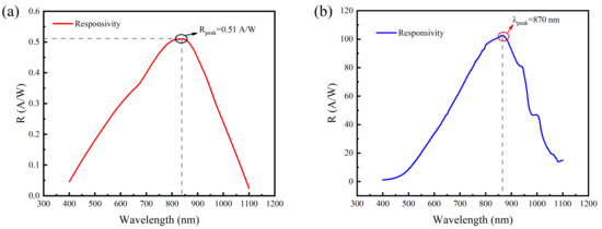 In addition, from Figure 4, it can be seen that the maximum gain factor exceeds 1000 when the reverse voltage is near Vbr. Also, it is evident that as the device gain increases from 1 to 100, the corresponding voltage regulation range is 60 V (ranging from 50 V to 110 V), which indicates that the fabricated DMSI-APD has favorable linear dynamic performance characteristics. The favorable linearity of the DMSI-APD device makes it suitable for LiDAR dynamic sensing in linear mode. Based on Equation (2), the device responsivity under different applied voltages can also be calculated (shown in Figure 5). The responsivity is estimated according to Equation (2):