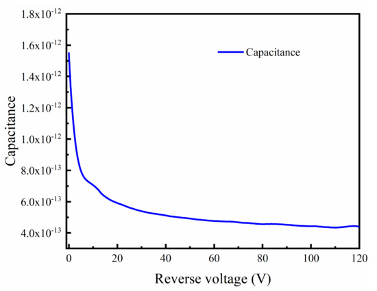The capacitance, as a function of reverse voltage, was measured and the rise time was calculated for the DMSI-APD device. Figure 6 illustrates the measured capacitance at various reverse voltages, with a measurement frequency of 1 MHz and a voltage step of 0.5 V. The results show a significant decrease in capacitance as the reverse voltage increased, and at the punch-through voltage state, the capacitance was below 500 fF, which was lower than that of most products, such as the Hamamatsu S14645 series. The main reason for the low capacitance is that the device depletion region is thicker and no additional parasitic capacitance was introduced after preparation, which also contributed to lowering the RC time constant of the device.