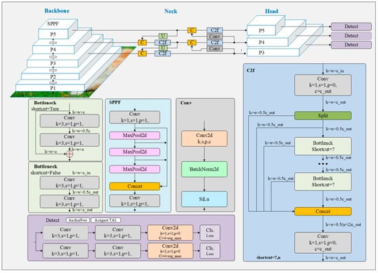 YOLOv8 [38] is an enhanced iteration derived from the YOLOv5 version developed by the Ultralytics open-source project, officially launched on 10 January 2023. YOLOv8 demonstrates versatility as a model that effectively addresses detection, classification, and segmentation tasks. The architectural composition is depicted in Figure 2 [38]. It is structured into three main components: the backbone, neck, and head. The backbone component functions as the layer for feature extraction, playing a crucial role in extracting target features of different scales through a top-down pathway. The neck segment is a feature fusion layer, employing the PAFPN strategy to integrate features from various scales. The head section consists of three detect modules designed to detect targets at different scales.