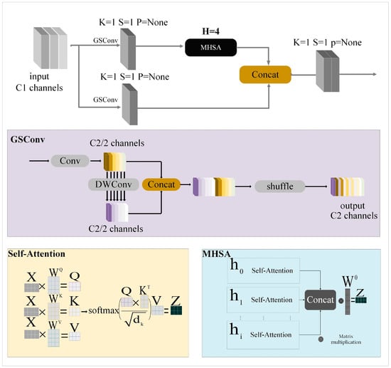 The RMA framework is designed to address the problems of gradient vanishing and explosion by providing a structured residual structure. Integrating GSCONV’s exceptional feature extraction capability with MHSA’s outstanding attention capacity leads to a robust detection performance, even in complex scenes. As illustrated in Figure 3, the structure of the RMA consists of two distinct branches. The upper branch first performs GSConv feature extraction, then strengthens the feature layer target information through MHSA. The lower branch performs the GSConv operation only once, to avoid losing target features due to excessive convolution. Finally, the feature maps of the two branches are combined by the concat operation. The GSConvs implemented within the RMA framework exhibit a stride length of 1. This design enhances the module’s capacity to learn local detail features, thereby improving the network’s ability to detect small targets and traffic targets whose feature information is weak. Additionally, it addresses the issue of detection for large-range targets. The MHSA used in this paper has four heads, which provide notable benefits in two critical areas. Firstly, it achieves a harmonious equilibrium between detection accuracy and speed. Secondly, it avoids the issue of inadequate attention capacity resulting from a limited number of self-attention layers and the problem of excessive degradation of feature information caused by an excessive number of layers. In the domain of autonomous driving, where intricate backgrounds introduce diverse interferences to targets, network models require exceptional feature extraction capabilities and feature attention capabilities to address background interference effectively. RMA embodies a successful integration of these two capabilities and has undergone thorough validation through experimental studies. These experiments have showcased its exceptional detection performance in intricate background inspection tasks.