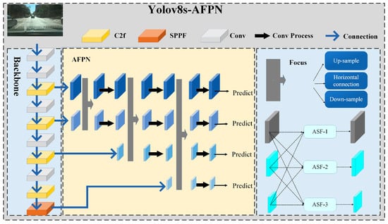 Consequently, this paper presents a new network architecture called YOLOv8s–AFPN, which combines the backbone region of YOLOv8s with AFPN. This combination is illustrated in Figure 4. The arrow box symbolizes an adaptive spatial fusion operation. The utilization of ASFF, which involves the weighting of feature maps at various levels, guarantees the successful fusion of feature maps across different levels. Experiments have shown that YOLOv8s–AFPN performs better in object detection tasks involving complex road scenarios.
