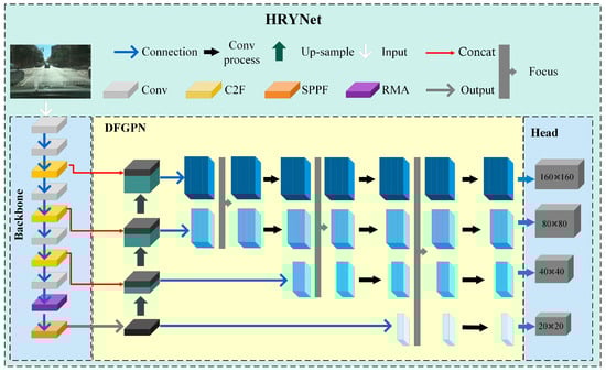 AFPN addresses the issue of non-adjacent layer feature information loss by the connection of non-adjacent layers. However, this approach also introduces a notable challenge. The recurrent interconnection among various layers imposes constraints on the feature extraction capabilities of individual network layers. In short, AFPN improves the attenuation phenomenon of low, medium, and high feature information by limiting the ability of the feature extraction layer. To tackle this challenge, the present study introduces a pioneering feature fusion strategy known as DFGPN, built upon the foundation of AFPN. The architectural design of the DFGPN is depicted within the delineated yellow region in Figure 5. The underlying principle of DFGPN entails the incorporation of a feature fusion region into the AFPN head. The fusion process involves integrating the foundational semantic information generated by the backbone model with the feature layers at different levels (low, medium, and high) within the backbone region. An integral element of this methodology involves relinquishing the intermediate scale, instead choosing to employ upsampling and fusion techniques to preserve the fundamental semantic characteristics of the final output derived from the backbone. After the concatenation operation, the resulting feature layer incorporates comprehensive information from various target scales and the underlying semantic information, enhancing its effectiveness in target detection tasks. The underlying semantic and shallow features are integrated during the fusion process, generating more robust and multi-scale semantic information. Compared with the AFPN, The DFGPN guarantees the tight integration of each non-adjacent layer and mitigates the information gap between these layers. Additionally, DFGPN addresses the limitation of feature extraction in the gradual process.