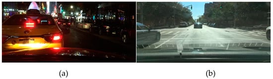 Realistic traffic scenes. (a) Traffic target image information in the night scene. (b) Traffic target image information in a bright light scene.