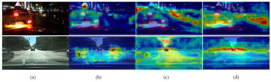 In deep learning object detection, heat maps help to understand which part of an image determine the final classification decision on the output of the model, and they are also a visual display of the performance of the network model detection. The visual representation of the network model’s detection performance is an additional function of the heatmap. To evaluate the feasibility of DFGPN and RMA individually, a selection of representative samples from both daytime and nighttime scenarios were chosen for heat map analysis. As depicted in Figure 7, it is evident that the feature information of the traffic target is significantly obscured in the densely illuminated and strongly lit environment.