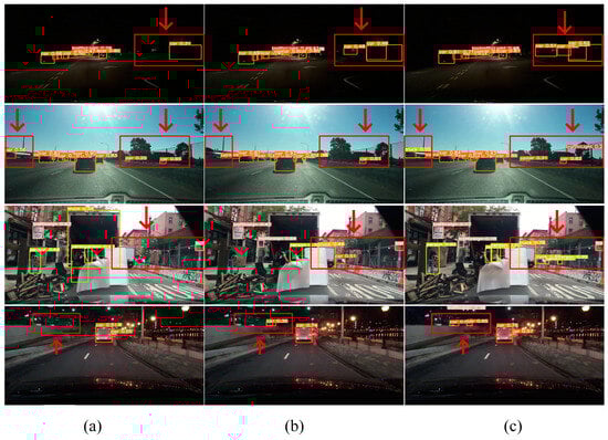 BDD100K actual detection effect on the dataset. The red arrow and border in the figure are post-processing, which aims at a quick and intuitive reading contrast effect. (a) Detection effect of the original algorithm YOLOv8s. (b) Detection effect of YOLOv8s–DFGPN. (c) Detection effect of HRYNet.
