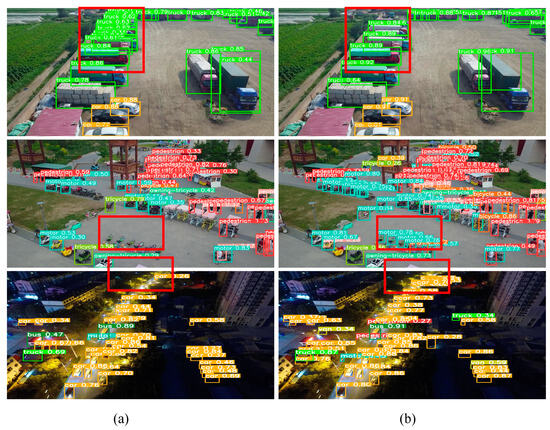 VisDrone actual detection effect on the dataset. The red borders in the figure are post-processing, which aims at a quick and intuitive reading contrast effect. (a) Detection effect of the original algorithm YOLOv8s. (b) Detection effect of HRYNet.