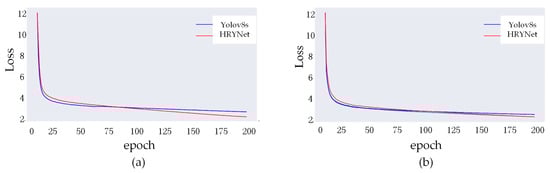 The loss function plays a pivotal role in evaluating the efficacy of a model’s learning process, as it quantifies the discrepancy between the predicted values and the actual values. The loss value in YOLOv8 is calculated as a weighted sum of the classification loss, localization loss, and confidence loss. The loss curves for both algorithms on the two datasets are illustrated in Figure 10, where the x-axis denotes the number of iterations, and the y-axis represents the cumulative loss value. The loss value for both algorithms experienced a substantial decrease during the initial training phases on various datasets. During the training process, it was observed that HRYNet initially had a slightly higher loss compared with YOLOv8s. However, as the training progressed, the loss value for HRYNet gradually surpassed that of YOLOv8s, indicating better performance in the middle and later stages. This observation suggests that HRYNet demonstrates a better learning capability.