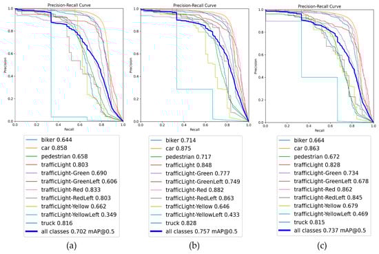 The training results on a custom dataset are further analyzed and validated in this article to assess the detection performance of the proposed algorithm. The custom dataset comprises 8940 images with 11 different categories, providing a diverse and rich collection of images for algorithm performance verification. Figure 11 illustrates the testing results of three algorithms on the custom dataset: YOLO8s, HRYNet, and LHRYNet. The upper part displays the precision–recall (P–R) curves for each category. In contrast, the lower part shows the average precision (AP) values for individual categories and the mean average precision (mAP) across all categories. A comparison between (a) and (b) reveals that HRYNet improves AP_0.5 for various categories, leading to a 5.5% increase in mAP_0.5. Comparing (a) with (c), LHRYNet demonstrates improvements for all categories except for “truck”. The mAP@0.5 has increased by 2.5%. The data presented in this figure indicate a significant enhancement in detection performance compared with YOLOv8s for the proposed algorithm.