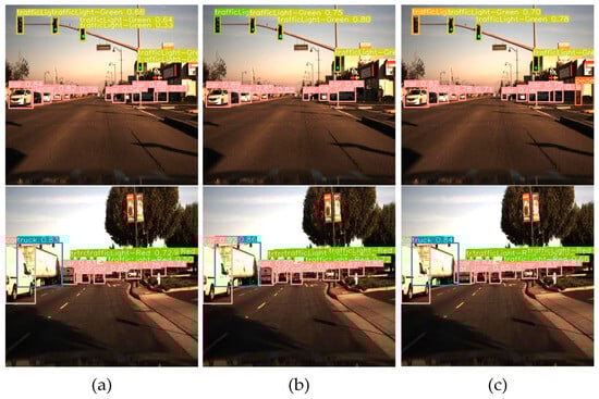 To evaluate the feasibility of utilizing DFGPN and RMA in intricate road environments, authentic images captured from diverse, complex roads were chosen to validate the model’s actual detection capabilities, as depicted in Figure 8. A comparison between YOLOv8s and YOLOv8S–DFGPN shows that the latter exhibits greater confidence when detecting identical target objects. Compared with the previous two methods, HRYNet performs better when detecting the same target, exhibiting higher confidence levels. Additionally, HRYNet effectively reduces the missed detection rate and false detection rate. The empirical findings of the detection results provide evidence for the practicality of HRYNet in the automatic driving target detection domain. The proposed method exhibits high robustness when confronted with intricate background interference, making it suitable for various road scenes.