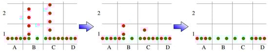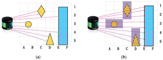 The gray raster marks the 2D voxel boundaries. Magenta lines mark the scanner lines of sight. The blue shape represents a static object, while the yellow shapes represent dynamic objects. Green and red dots represent the measured points taken from two different scans: scan-I and scan-II. (a) The dynamic objects appear briefly in scan-I and are hit by lasers. (b) The dynamic objects disappear in scan-II and are passed through by lasers, and the grids A3, B3, C1, C2, D4, and D5 (the purple grids) where they are located are identified as dynamic grids, allowing filtering out of the point cloud within them.