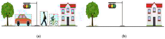 (a) Dynamic objects are accurately identified for their respective categories, such as vehicles, pedestrians, or cyclists, and the detection bounding box is formed around them to segment the dynamic point cloud; (b) the point clouds inside the bounding box are removed to obtain a static scene model.