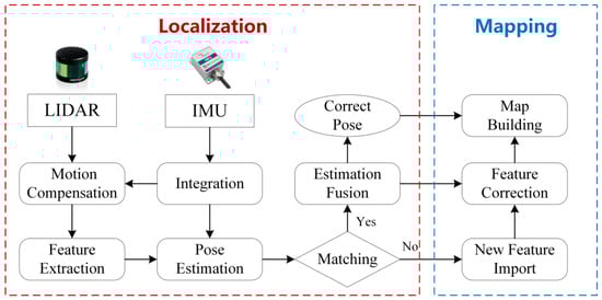 SLAM technology has made significant strides over the past few decades. As far back as 1992, the feature-based fusion SLAM framework [99] was established. The SLAM framework based on 3D LiDAR primarily organizes the SLAM according to its functionality, namely, localization and mapping, as shown in Figure 7. As SLAM technology has developed, localization and mapping have evolved from two distinct modules into a comprehensive system. The two modules promote each other. The high-precision odometer composed of multiple sensors provides real-time pose estimation for the robot and the basis for the reconstruction and stitching of the 3D scene. Similarly, high-precision 3D reconstruction provides important data for pose estimation for feature-based odometry. Even a separate odometer system is also inseparable from the establishment or storage of temporary local maps to assist pose estimation [100].