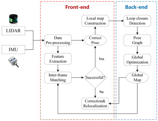 In terms of components, the modern SLAM system based on 3D LiDAR can generally be divided into two stages: the front-end and the back-end, as illustrated in Figure 8. The front-end is responsible for the real-time collection of raw data from the environment, feature extraction and matching, pose estimation for the current scan, and storage of corresponding local map information. Meanwhile, the back-end is primarily responsible for loop closure detection, triggering global drift correction, and optimizing pose estimation for large-scale 3D scene reconstruction. Precisely because the front-end and back-end belong to different stages with different roles and receive and process different data and information, different processing strategies exist in the SLAM framework based on 3D LiDAR for different classes of dynamic objects.