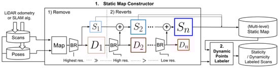 In recent years, significant progress has been made by integrating the visibility principle with semantic segmentation techniques for point clouds. Chen et al. proposed the LiDAR-MOS framework [64], which enables real-time detection and filtering of dynamic objects. Their approach utilizes three classical point cloud segmentation networks, namely RangeNet++ [65], SalsaNext [66], and MINet, to project the point cloud as distance images and compute residuals between the current and previous scans based on the visibility. These residual images are then combined with the current distance image and used as inputs to a fully convolutional neural network. The network is trained with the binary label to effectively distinguish between moving and stationary objects. Compared to Kim et al.’s method, this approach has the advantage of not relying on the pre-constructed map and operates online using only past LiDAR scans, resulting in improved real-time performance. However, one potential drawback is that it might miss some dynamic objects that are temporarily stationary for a certain period of time.