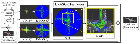 - Lim, H.; Hwang, S.; Myung, H. ERASOR: Egocentric ratio of pseudo occupancy-based dynamic object removal for static 3D point cloud map building. IEEE Robot. Autom. Lett. 2021, 6, 2272–2279. [Google Scholar] [CrossRef]