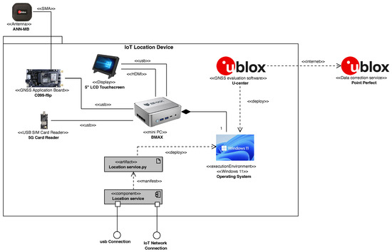 The UML deployment diagram in Figure 1 shows a combination of hardware and deployment views of the IoT location device. The hardware view indicates the typologies of hardware components selected to design the device and their connections. As the figure shows, the IoT location device is centered purely on a physical node, which is a BMAX <<mini PC>> equipped with a Windows 11 Operating System acting as <<execution environment>>.