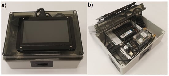 (a) Polycarbonate box with 5 inch screen for interfacing with the IoT system and (b) IoT Location Device Packaging (overall measurements: 19.5 cm × 15 cm × 9.5 cm).