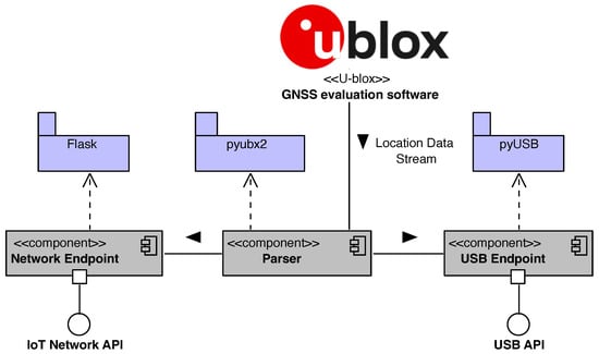 Similarly, the USB Endpoint component, implemented using the pyUSB (https://github.com/pyusb/pyusb (accessed on 9 November 2023 ) library, provides the USB API that can be used to export the parsed positioning data to other devices through a USB connection.