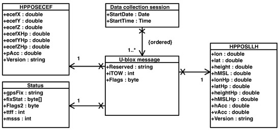 The complete description of the <<u-blox>> protocol (https://content.u-blox.com/sites/default/files/documents/u-blox-F9-HPG-1.32_InterfaceDescription_UBX-22008968.pdf (accessed on 23 September 2023 ) defines all the messages that the user can activate on demand. The document describes the interface of the u-blox F9 high-precision GNSS receiver. The interface consists of different protocols, such as NMEA, UBX, RTCM, and SPARTN (Secure Position Augmentation for Real-Time Navigation) [36]. The latter is used to supply the GNSS receiver with real-time correction data. The SPARTN 2.0 support is implemented according to its Interface Control Document (https://www.spartnformat.org/wp-content/uploads/220221_SPARTN_v2.0.2.pdf (accessed on 7 September 2023). On the other hand, the UBX protocol is required to output high precision solutions. The UML class diagram in Figure 4 shows the data view of the signals parsed by the Location service component. As indicated in the figure, the parser generates a Data collection session with a starting date and time.
