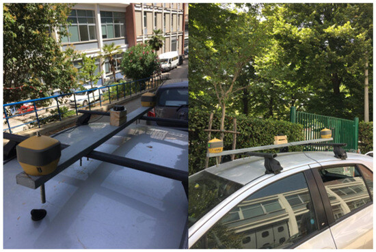 Afterwards, to obtain the ground truth, a pair of geodetic-grade Topcon Hiper HR GNSS receivers serving as rovers were mounted at the end of an aluminium bar designed for the purpose and placed above the test vehicle, as shown in Figure 6. Moreover, the experimental setup was completed by placing a base station on a point of known coordinates. The location of the base station, depicted in Figure 5 by a magenta triangle, was chosen to minimise the Post-Processing Kinematic (PPK) baseline. Figure 7 reports two images of the car roof equipped with the described instrumentation. The GNSS antenna setup was designed to allow the epoch-by-epoch computation of the true installation point of the low-cost antenna; hence, the positioning errors of the solutions provided by the IoT location device were calculated with respect to this reference.