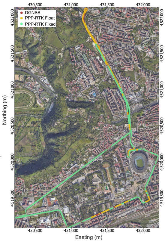 Considering the bottom part of Figure 9, it can be seen that the float solutions are mainly grouped within the time intervals from 12:43 to 12:45 and from 12:57 to 12:58; these were identified as the more unfavourable for the GNSS receiver due to the presence of reflective features resulting in a high multipath effect. Specifically, the leftmost yellow region corresponds to areas with high buildings on the left side and trees on the right side, whereas the rightmost yellow region corresponds to a scenario that can be properly assimilated to an urban canyon, as the street is surrounded by tall trees and buildings on both sides. Conversely, the figure reports extended parts (the green background) where the GNSS receiver was able to resolve and maintain the ambiguity resolution at integer values. These parts mostly correspond to favourable scenarios, except for the rightmost region, which corresponds to an urban scene due to the presence of the “Diego Armando Maradona” football stadium and the medium-size buildings on the other side.