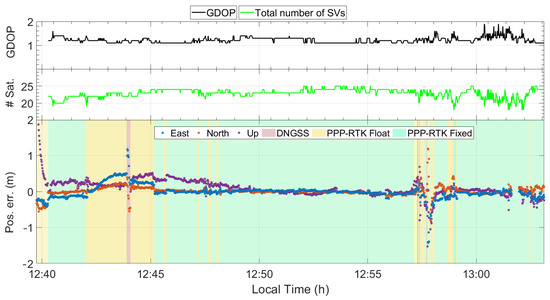 Figure 9 illustrates the time series detailing errors in the East, North, and Up coordinate components, and additionally includes the associated number of satellites and the Geometric Dilution of Precision (GDOP). The errors in the East, North, and Up directions are represented by blue, red, and yellow markers, respectively, while the parts with green, yellow, and red background colors correspond to PPP-RTK fixed, PPP-RTK float, and DGNSS solutions, respectively.