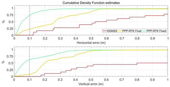 Figure 10 reports the cumulative density function estimates of the horizontal and vertical positioning errors in the top and bottom panels, respectively. The green, yellow, and red lines refer to PPP-RTK fixed, PPP-RTK float, and DGNSS solutions, respectively. The top panel of Figure 10 highlights that when the phase ambiguity is resolved at integer values, about 75% of the solutions have a horizontal error of less than 0.1 m and 96% show a horizontal error below 0.3 m. As expected, the performance worsens when the solution is of the float type; only 22% of the float solutions show a horizontal error below 0.1 m, whereas 63% show a horizontal error below 0.3 m. The bottom panel of Figure 10 indicates that the solution accuracy is worse when compared to horizontal one, as when the phase ambiguity is resolved at integer values only 62% of the solutions have an absolute value of the vertical error of less than 0.1 m and 87% show an error below 0.3 m. Furthermore, when the solution is of the float type, 8% of solutions show an error below 0.1 m, whereas 67% show an error below 0.3 m.