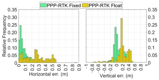 Relative frequency histograms of the horizontal (left panel) and vertical (right panel) errors. The green bars correspond to PPP-RTK fixed solutions, while the yellow bars refer to PPP-RTK float solutions.