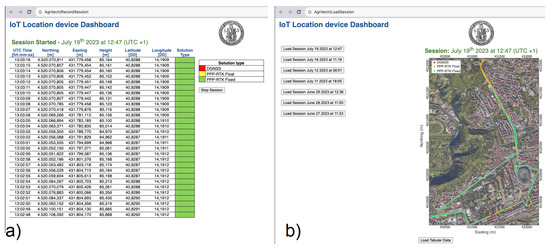 The web app mainly provides two dashboards. The one depicted in panel (a) of Figure 14 is used to record a session. During a recording session, the table shown in the panel is updated in real time with the epoch-by-epoch positioning data, reporting the UTC time, geographic and Cartesian coordinates, and corresponding solution status. At the end of the recording session, the positioning data are saved in the data storage implemented in <<MongoDB>>. Each stored session is named with the date and starting time of recording. The second dashboard provided by the web app, shown in panel (b) of Figure 14, permits the loading of stored sessions. When loaded, the data can be visualised in either a tabular view or a 2D map view. The latter view displays the recorded positions on a Google map satellite view, with each marker is coloured according to the solution status.