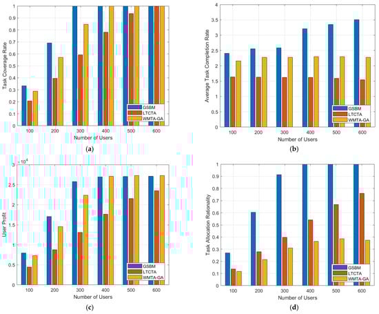 Performance comparison chart according to different numbers of users. (a) Task coverage rate; (b) Average task completion rate; (c) User profit; (d) Task allocation rationality.