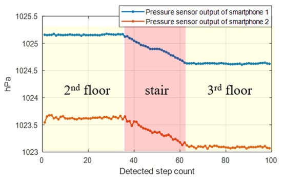 Accurately estimating a user’s floor in a high-rise building is extremely important information that can be used not only for LBS but also for emergency positioning []. Floor identification is the first step in target localization in multistory buildings. A study on floor estimation using a pressure sensor was conducted by researchers []. The pressure sensor responds immediately to the user’s altitude change, and its resolution is extremely high; therefore, it is possible to recognize sub-meter-level altitude changes. Because the pressure sensor includes a bias value, the user’s floor change can be recognized by the pressure sensor alone. However, to estimate the absolute altitude, calibration and external pressure information are required. Figure 1 shows the change in pressure when moving up one floor using two smartphones. As the altitude of the user increases, the air pressure decreases, and although the change patterns of the two smartphones are similar, a pressure difference occurs. In addition, the pressure value changed even when the pedestrian was stationary. In other words, this indicates that to estimate the altitude employed using the pressure sensor, its calibration and real-time sea level pressure information are required []. Consequently, these methods are difficult to apply universally because of the need for reference barometric pressure information and the need to pre-calibrate the pressure sensor in the user’s smartphone.