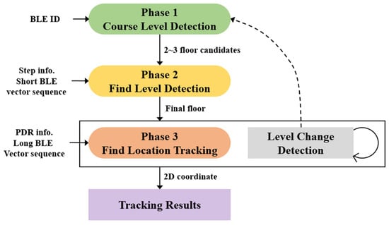 where and denote the largest and second largest value among vector , respectively. When the ratio surpasses the FLD threshold, the user’s floor is confirmed. Upon this determination, the FLT module activates, utilizing the user’s RSSI vector sequence and PDR trajectory to precisely track the user location.