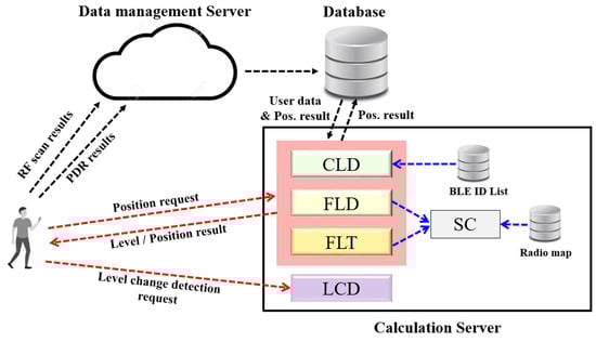 Figure 3 shows the data transmission and location request processes of the proposed system. The proposed system estimates the 3D positions of multiple users in real time using a cloud platform. It uses two servers. Separating the data management server that manages the transmitted user data from the location calculation server that responds to the user’s location request facilitates data management and responds to the user’s location request more quickly. Mobile devices transmit RF data and PDR results to the data management server. RF data were sampled every 0.2 s, and five BLE vectors were collected and transmitted every second. The PDR results comprise the step index, step length, and heading, and five sets of PDR results were collected and transmitted. The data management server stores the data received from multiple users in the database. In the calculation server, a position estimation module suitable for the current phase is performed for each user. As described, there are four localization modules in the calculation server. Each module was executed according to the user’s conditions. In addition, the BLE installation table, which stores information on the BLE installed on each floor, and the radio map, which stores RSSI spatial patterns, are also included in the server.