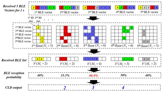 where denotes the nth BLE beacon ID installed on the ith floor. Figure 4 illustrates the CLD process. Identical colors represent BLE modules installed on the same floor. In the CLD module, the BLE vector received over a 1 s duration is utilized. In the proposed system, since the BLE vector is sent to the cloud server every 0.2 s, five BLE vectors are queried from the server. These vectors are then sorted by floor, and user BLE lists are generated for each floor. If a particular BLE beacon is detected even once out of these five times, it is marked as received. The received BLE list for the ith floor is expressed as follows: