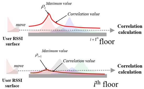 To determine the user’s current floor, FLD examines the maximum correlation value for each floor. The outcome obtained by computing the correlation between the user’s RSSI pattern and the radio map is denoted as the surface correlation coefficient (SCC). If the ratio between the maximum and the second-highest correlation value surpasses the FLD threshold, the floor with the top correlation is identified as the user’s current floor. The vector of the maximum correlation values for the two floors in Figure 5 can be expressed as follows: