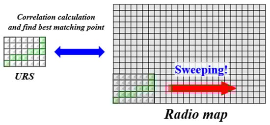 SC operates based on the fingerprinting method. That is, it compares the user’s RSSI pattern with a radio map and considers the position with the highest similarity as the current location. SC does not simply estimate the location using a single RSSI vector; instead, it uses accumulated RSSI vectors to determine the location. It synchronizes the user’s trajectory with the RSSI vector sequence to create an RSSI distribution in space. Figure 7 depicts the creation of URS using the PDR trajectory and the RSSI vector sequence. The URS includes the spatial distribution of RSSI. SC calculates the similarity between the URS and the radio map and takes the position with the highest correlation value as the current location. Figure 8 illustrates the operation process of SC. It moves the URS over the radio map to find the optimal position with the highest correlation. In traditional fingerprinting methods, user data are merely a single vector. The location is determined by calculating the similarity with the radio map and selecting the RP with the smallest difference in the RSSI pattern. The proposed method creates user data in the form of a surface and computes their correlation with the entire radio map. This is why it has been named ‘surface correlation’. By aggregating RSSI to determine the location, it enhances spatial discernment and provides accurate location results even in noisy indoor environments.