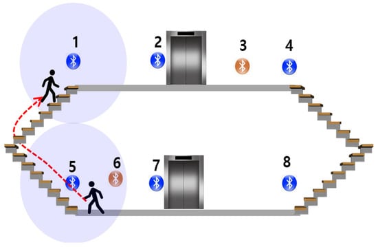 LCD relies on the strength of the BLE signal installed around stairs or elevators. Figure 9 illustrates the principle behind the LCD process. We assumed the installation of eight BLE beacons. While all beacons are utilized in the FLT, only a specific beacon (indicated in blue) is utilized in the LCD. LCD periodically monitors the blue beacons. If the user is downstairs, one of the blue beacons (5, 7, or 8) will have the maximum signal strength. When the user ascends using the left staircase, the RSSI value of beacon 1 reaches its peak. If a beacon installed on a different floor than the one determined through FLD registers the maximum signal value, LCD transitions the user’s state into the CLD phase.
