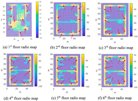Radio map of each floor. Red arrows indicate the beacon installation positions.
